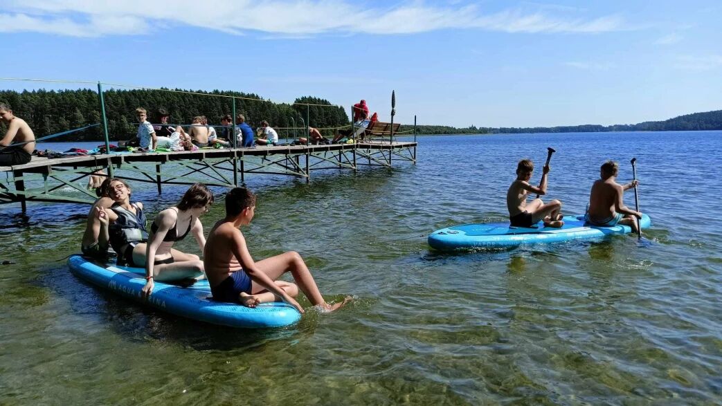 przystań żeglarska z kajakami, rowerami wodnymi i bananem wodnym